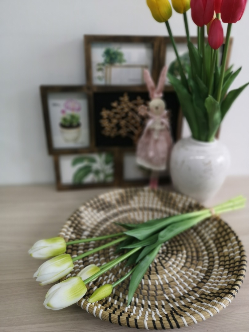 Тюльпаны выполнены из силикона.